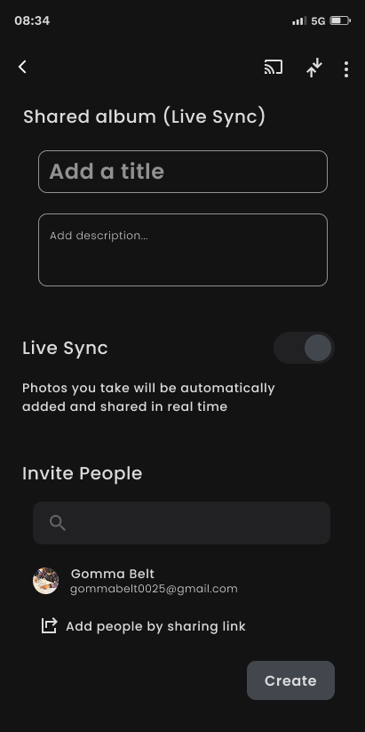 Selecting “Shared Album (Live Sync)” opens a familiar album creation interface with LiveSync enhancements